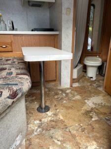 Separate shower and toilet bathroom with storage cabinet, carpeted bed over goosnec, refrigerator and cooktop with wooden cabinets