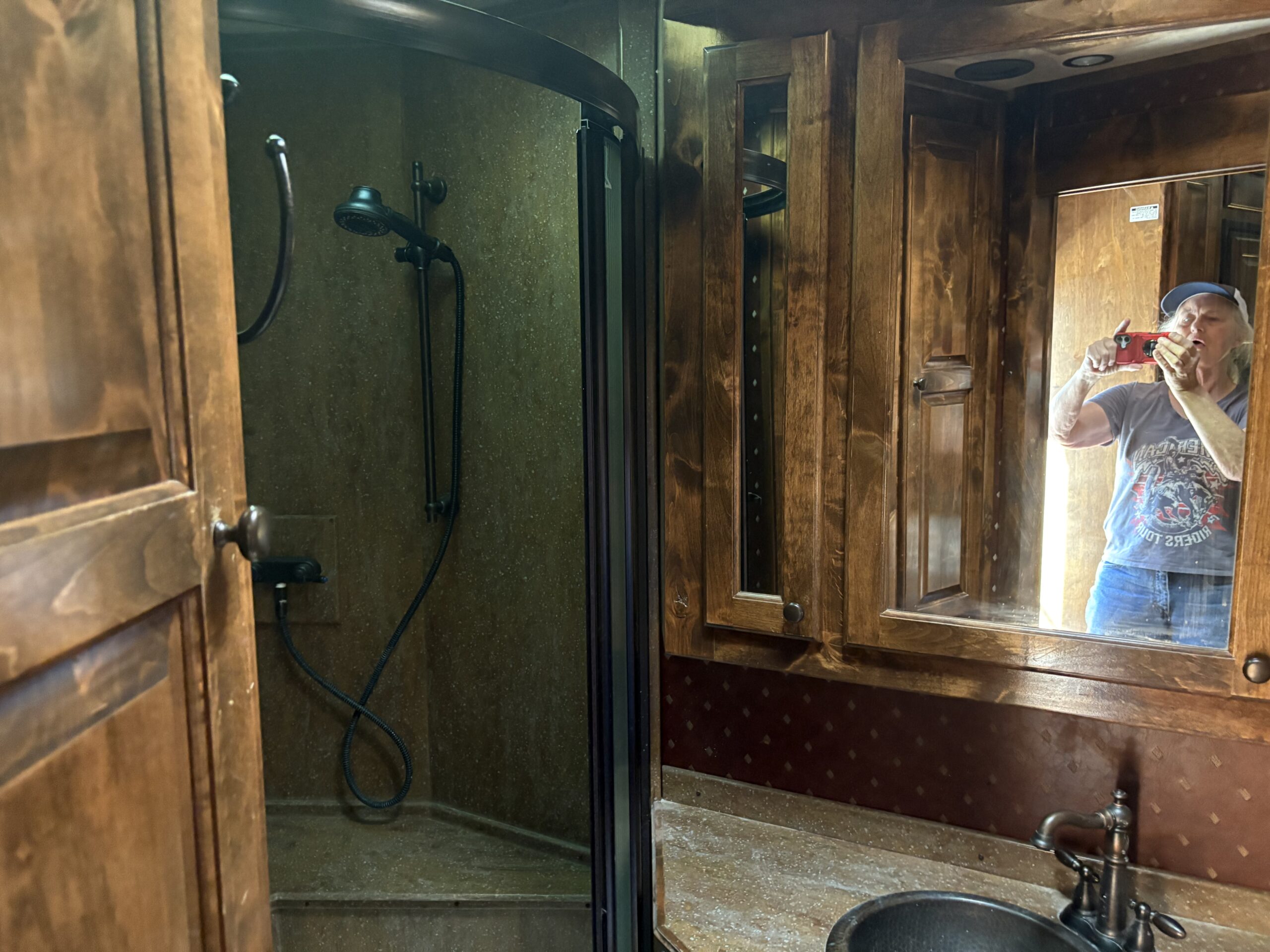 Tuscan-style living quarters with granite counters, copper sinks and fittings. Leather couch and recliners. Bathroom also has copper sink and fittings and large corner shower with rounded door.