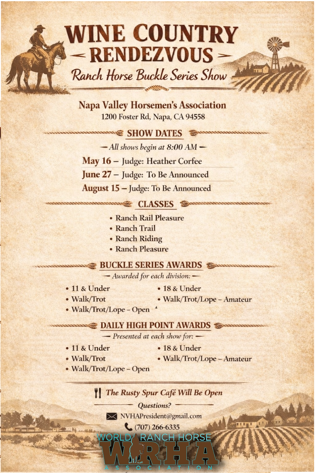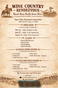 MinutesJoin us at the Napa Valley Horsemen's Association for our 2026 Wine Country Rendezvous; May 16, June 27 and August 15. Classes will include Ranch Rail Pleasure, Ranch Trail, Ranch Riding, Ranch Pleasure. Buckle series awards for the following divisions; 11 & Under, Walk/Trot, Walk/Trot/Lope - Open, 18 & Under, Walk/Trot/Lope - Amateur. The Rusty Spur Cafe will be open.